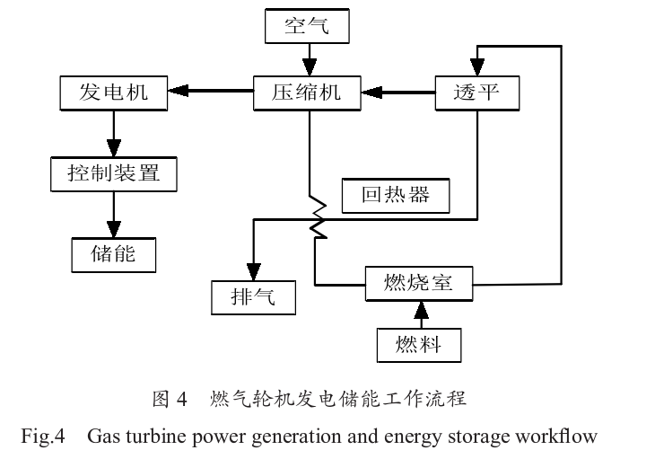 燃?xì)廨啓C(jī)發(fā)電儲能是通過燃料供給系統(tǒng)將天然氣輸送到燃燒室。天然氣在燃燒室內(nèi)與空氣混合燃燒,產(chǎn)生高溫高壓的燃?xì)?。這些高溫高壓的燃?xì)庋杆倥蛎?并流經(jīng)透平葉片, 推動透平旋轉(zhuǎn)。透平葉片通過軸連接到發(fā)電機(jī),透平的旋轉(zhuǎn)帶動發(fā)電機(jī)的轉(zhuǎn)子旋轉(zhuǎn),從而在定子中產(chǎn)生電流,完成電能的轉(zhuǎn)換。最終將電能儲存到儲能系統(tǒng)中,以便在電力需求高峰期或電網(wǎng)出現(xiàn)故障時進(jìn)行釋放和使用。如圖4所示。在燃?xì)廨啓C(jī)發(fā)電儲能過程中,儲能系統(tǒng)可以幫助平衡燃?xì)廨啓C(jī)發(fā)電的輸出波動。燃?xì)廨啓C(jī)的啟動和停止時間較長,且燃料燃燒效率和發(fā)電效率容易受環(huán)境溫度和負(fù)荷變化的影響。通過儲能系統(tǒng)的調(diào)節(jié),可以在短時間內(nèi)補(bǔ)償輸出功率的波動,確保電網(wǎng)的穩(wěn)定運行。在負(fù)荷較低時,燃?xì)廨啓C(jī)的效率較低, 部分燃料會被浪費。儲能系統(tǒng)可以在這種情況下存儲多余的電能,并在電力需求高峰期釋放,減少燃?xì)廨啓C(jī)的啟動和停止次數(shù),從而提高整體的能源利用效率。