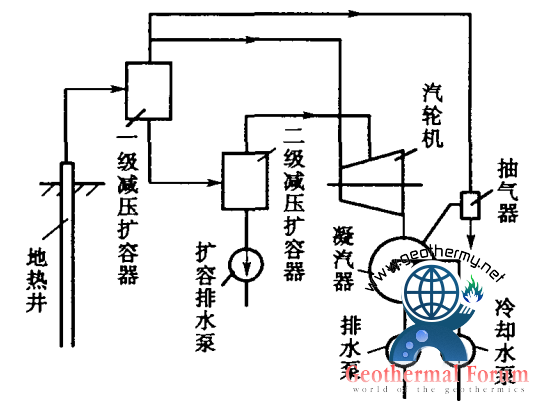 圖2是多級閃蒸(多級減壓擴(kuò)容)蒸氣循環(huán)的流程圖。從井口流出的熱水先進(jìn)入第一級減壓擴(kuò)容器,產(chǎn)生的蒸氣進(jìn)入汽輪機(jī)的高壓部分,而從第一級閃蒸器底部出來的閃蒸后的剩余熱水再進(jìn)入第二級閃蒸器(擴(kuò)容器),產(chǎn)生二次閃蒸蒸氣,并通往汽輪機(jī)低壓部分做功。若井口出來的是濕蒸氣,則直接進(jìn)入汽水分離器,蒸氣分離出來后去高壓部分做功,熱水再進(jìn)入第二級閃蒸器(減壓擴(kuò)容器),所以實(shí)際上是用一個汽水分離器代替了第一級閃蒸器,如(圖1-b)所示。第二級閃蒸器分離出來的熱水壓力若高于大氣壓力,則熱水可以自行排出;不然,就要用排水泵抽出。閃蒸器的級數(shù)增加,單位質(zhì)量工質(zhì)輸出功也增加,即地?zé)崴?/a>中的能量愈能得到充分利用。當(dāng)級數(shù)無限多時(shí),理論上可以得到最大的輸出功,增益達(dá)到極限。但是,級數(shù)增加將使設(shè)備投資增加,系統(tǒng)變得復(fù)雜,所以實(shí)際采用的閃蒸級數(shù)一般不超過四級。地?zé)崃黧w溫度高可以級數(shù)多些,熱水溫度較低時(shí)就不宜采用二級以上的閃蒸系統(tǒng)。