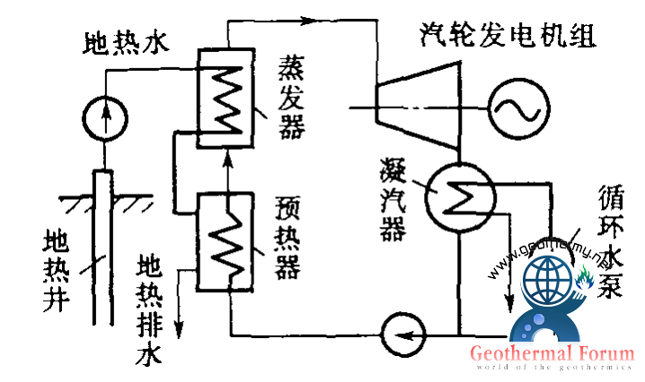 雙循環(huán)地?zé)岚l(fā)電系統(tǒng)是利用地下熱水來加熱某種低沸點工質(zhì),使其進入汽輪機工作的地?zé)岚l(fā)電系統(tǒng),又稱中間介質(zhì)法或低沸點工質(zhì)循環(huán)。它是為克服閃蒸地?zé)岚l(fā)電系統(tǒng)的缺點而出現(xiàn)的一種循環(huán)系統(tǒng)。地下熱水用深井泵抽到地面進入電站內(nèi)的蒸發(fā)器,加熱某一種低沸點介質(zhì)(如氟里昂11、氯乙烷等),使之變?yōu)榈头悬c介質(zhì)蒸氣,然后通入汽輪機做功發(fā)電,汽輪機排出的乏汽經(jīng)凝汽器冷凝成液體,用工質(zhì)泵再打回蒸發(fā)器重新加熱,循環(huán)使用。為充分利用地?zé)崴?/a>的余熱,讓從蒸發(fā)器排出的地?zé)崴?/a>經(jīng)過一個預(yù)熱器先預(yù)熱來自凝汽器的低沸點工質(zhì)液體,使其溫度上升至接近蒸發(fā)器內(nèi)的工質(zhì)飽和溫度,再進入蒸發(fā)器。為了保證從地?zé)峋?/a>來的地?zé)?/a>水在輸送過程中不閃蒸成蒸氣和不使溶解氣體從水中逸出,在管路中的熱水始終保持超過其溫度對應(yīng)的飽和壓力。