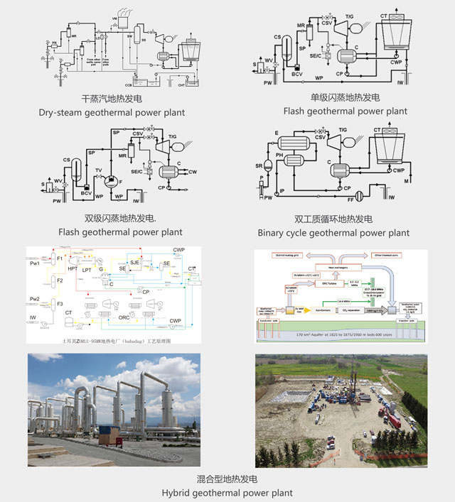 地?zé)岚l(fā)電需根據(jù)地熱流體的溫度、壓力以及它們的水、汽品質(zhì)的不同而采取不同的設(shè)計方案。其主要類型包括:干蒸汽地?zé)岚l(fā)電、單級閃蒸地?zé)岚l(fā)電、雙級閃蒸地?zé)岚l(fā)電、一井一站地?zé)岚l(fā)電、混合型地?zé)岚l(fā)電、雙工質(zhì)循環(huán)地?zé)岚l(fā)電、干熱巖發(fā)電。