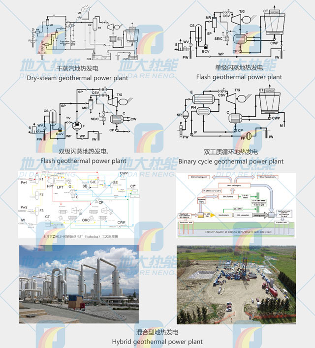 地熱發(fā)電需根據(jù)地熱流體的溫度、壓力以及它們的水、汽品質(zhì)的不同而采取不同的設計方案。其主要類型包括:干蒸汽地熱發(fā)電、單級閃蒸地熱發(fā)電、雙級閃蒸地熱發(fā)電、一井一站地熱發(fā)電、混合型地熱發(fā)電、雙工質(zhì)循環(huán)地熱發(fā)電、干熱巖發(fā)電。