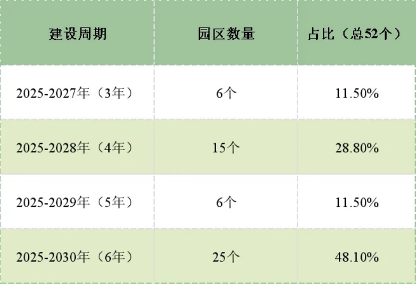 25個園區(qū)選擇6年建設(shè)周期(2025-2030年),占比接近50%。園區(qū)零碳轉(zhuǎn)型需要經(jīng)歷碳排放核算摸清底數(shù)、產(chǎn)業(yè)結(jié)構(gòu)優(yōu)化升級、清潔能源全面替代等全流程,尤其是石化、鋼鐵、有色金屬等傳統(tǒng)高耗能園區(qū),轉(zhuǎn)型難度大、涉及環(huán)節(jié)多,必須給予充足的時間窗口持續(xù)推進。