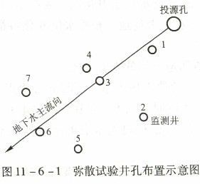 試驗(yàn)在沿地下水流向上布置的試驗(yàn)井組[投源井(注入井)及若干觀測井]中進(jìn)行,見圖11 -6 -1。