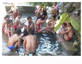 云南躍進(jìn)橋溫泉風(fēng)景澡堂會(huì)的熱水最高達(dá)70-80度,由于是自然溫泉,含有多種礦物質(zhì)和稀有金屬元素,對(duì)人體的某些疾患有特殊的療效,因而慕名前往洗浴的客人遠(yuǎn)到西藏也不乏大有人在,只是現(xiàn)在的時(shí)間主要是周邊的人們,到三、四月份就會(huì)有更多遠(yuǎn)方的西域者陸續(xù)到來。不少洗浴者一洗就是十天半月,更有甚者能洗兩到三個(gè)月,目的是治病,據(jù)說還真有不少人治好了疑難雜癥,不然的話怒江“澡堂會(huì)”怎么會(huì)在印度、尼泊爾、巴基斯坦、新加坡、馬來西亞甚至美國(guó)等地聞名遐邇。