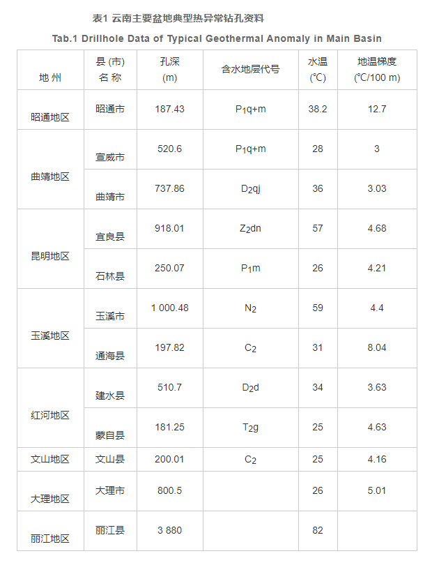 云南中低溫水熱活動區(qū), 主要分布在滇東斷陷盆地中, 水溫相對較低, 但流量大, 共有地熱泉260余處, 地熱鉆孔100多個, 熱泉天然熱流量7.8×104卡/秒, 泉流量4.9米3/秒。以往的勘探成果顯示, 昆明、玉溪、曲靖、昭通、紅河、文山地區(qū)的很多盆地中, 都存在有儲量較大的地熱田 (表1) 。